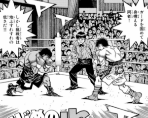 全日本新人王決定戦。持ち前のパワーで一歩をKO寸前まで追い詰めるが、一歩が放ったテンプルの一撃で意識を失っており、それでも声援に突き動かされ戦い続けたが、3R終了後コーナーから立ち上がることができずに棄権負けとなった。