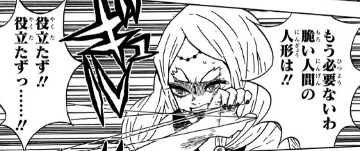 【VS竈門炭治郎・嘴平伊之助 敗北】 糸で鬼殺隊隊士を操り炭治郎・伊之助の行く手を阻むが、奥の手の首無しの鬼を繰り出すも倒され、伊之助の投擲で炭治郎が飛んでくると、「死ねば解放される、楽になれる」と自ら頚を差し出し、炭治郎の干天の慈雨によっ... -