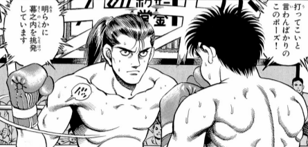 【VS幕之内一歩】 伊達の日本フェザー級王座防衛戦の前座の試合。コークスクリュー・ブローのタイミングを見切られアッパーを浴び追い詰められると、そこから乱打戦に持ち込まれ最後はコークスクリュー・ブローにカウンターを合わされTKOで敗れる。 【VS島... -