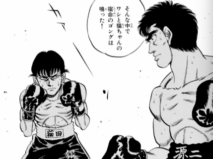 【VS鴨川源二】 科学的スポーツ理論を取り入れた鴨川の技術に追い詰められるが、猫田の殺気の篭もった本物のフェイントで隙を作り、そこから鴨川のリズムが狂いKO勝利を収める。 【VSラルフ・アンダーソン】 野性的動きと軽量級のスピードで翻弄し追い詰め... -