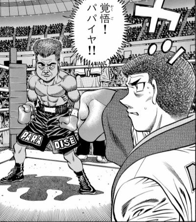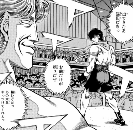【VS青木勝】 鷹村のWBC世界ミドル級タイトルマッチの前座の試合。ココナッツパンチでKO寸前まで追い詰めるが、スタミナ切れで泥試合にもっていかれる。最後は判定で引き分けに。 【VS青木勝】 鷹村のWBC世界ミドル級防衛戦の前座の試合。異様なほど鍛えて... -